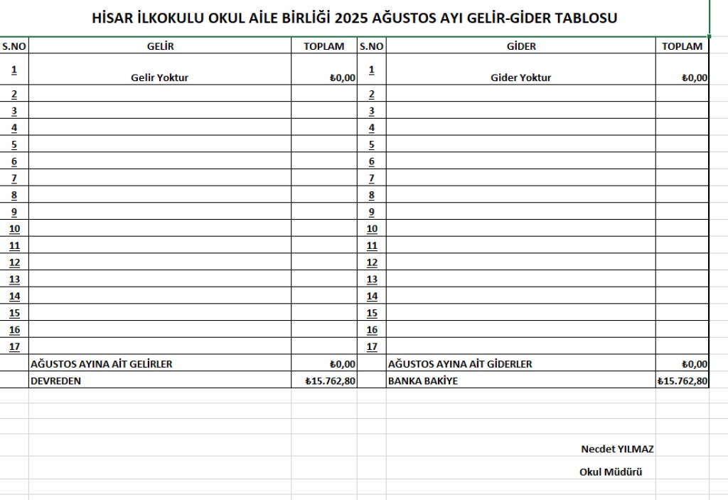 HİSAR İLKOKULU OKUL AİLE BİRLİĞİ 2025 AĞUSTOS AYI GELİR-GİDER TABLOSU